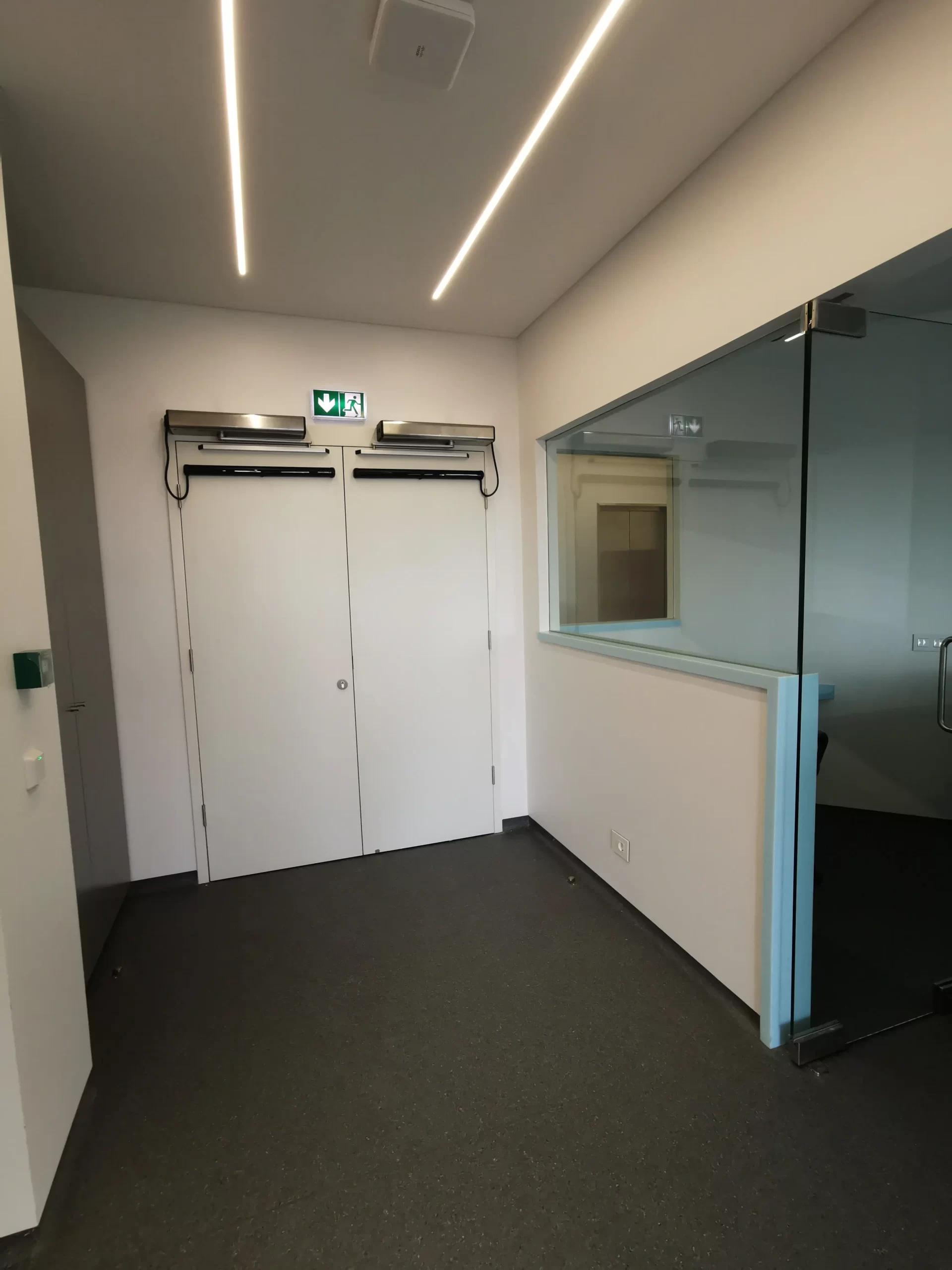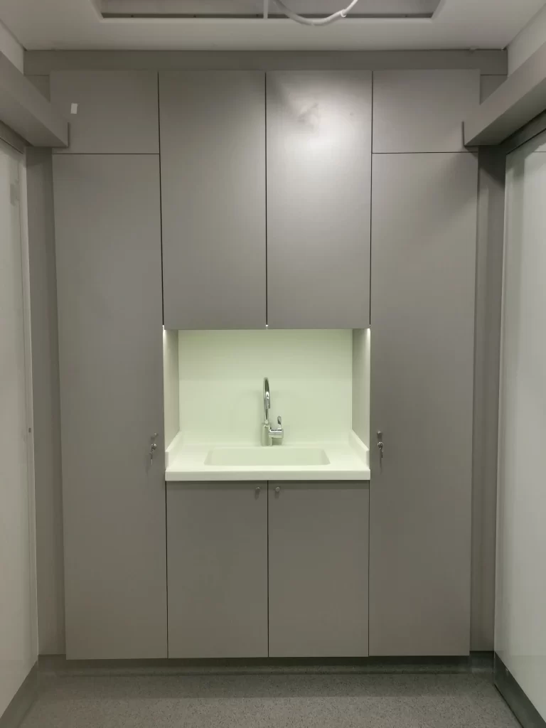 Our work also included custom-made wood and resin countertops, desks, and returns for the offices, luxurious head-bed panels made from glossy white MDF boards, stainless-steel strips and aluminum frames, as well as heavy-duty storage cabinets and custom-made resin top sinks. The use of 316-degree stainless steel for all rails ensures that the facility is protected against corrosion.